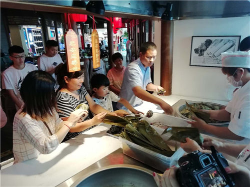 6月6日,长清服务区内,游客体验包粽子。