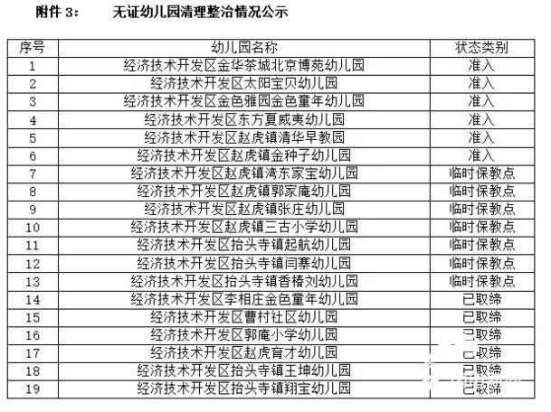 德州经济技术开发区金华茶城北京博苑幼儿园、太阳宝贝幼儿园、金色雅园金色童年幼儿园、东方夏威夷幼儿园、赵虎镇清华早教园、赵虎镇金种子幼儿园经整改后已具备办园条件,批设为合法民办幼儿园;赵虎镇湾东家宝幼儿园、赵虎镇郭家庵幼儿园、赵虎镇张庄幼儿园、赵虎镇三古小学幼儿园、抬头寺镇起航幼儿园、抬头寺镇闫寨幼儿园、抬头寺镇香椿刘幼儿园整改后具备基本办园条件,且无重大安全隐患需要保留,批设为临时保教点,由各乡镇中心幼儿园代管;李相庄金色童年幼儿园、曹庄社区幼儿园、郭庵小学幼儿园、赵虎育才幼儿园、抬头寺镇王坤幼儿园、抬头寺镇翔宝幼儿园不符合办园条件,且存在安全隐患,予以取缔。