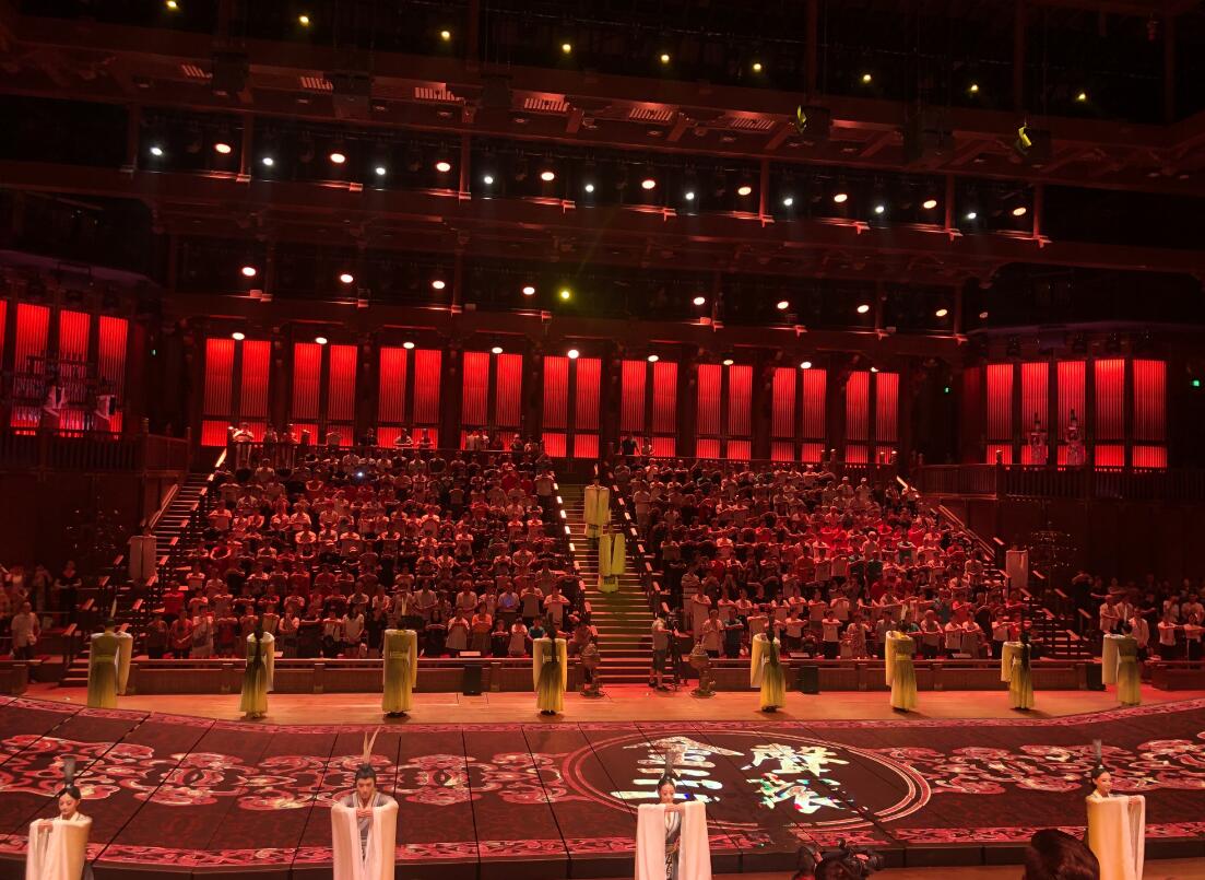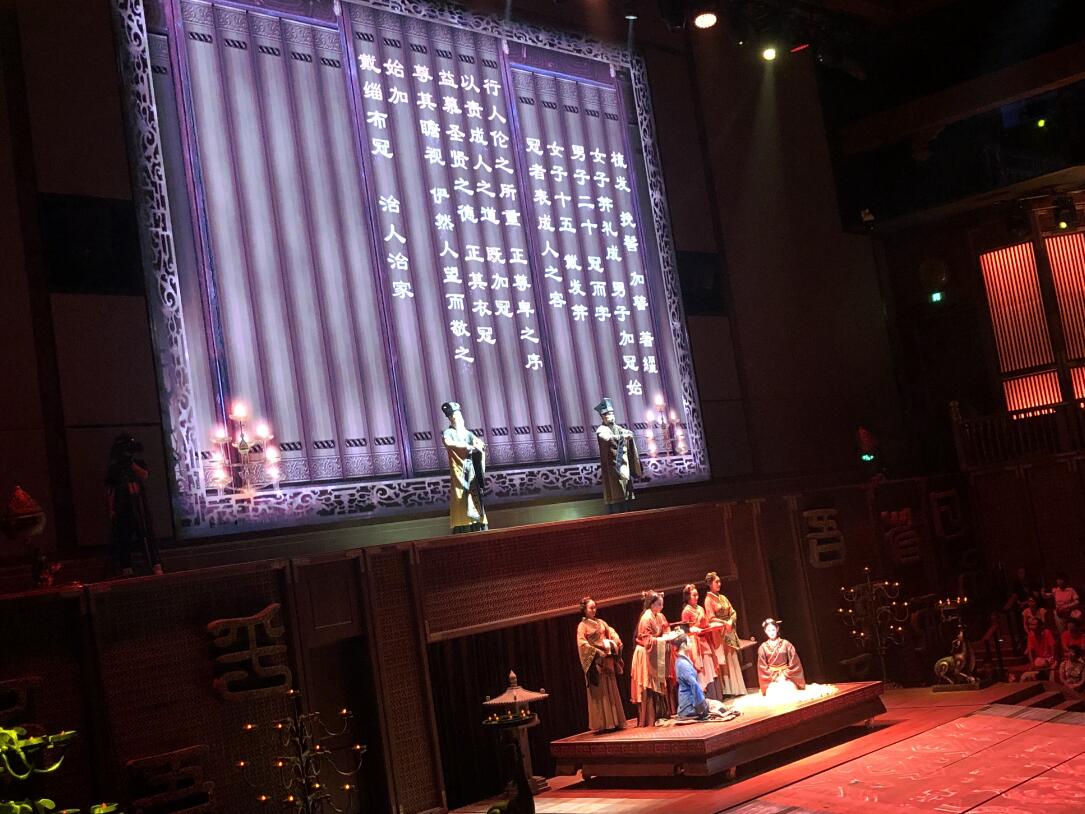启动仪式后,大型礼乐演出《金声玉振》精彩上演。《金声玉振》大型演艺节目,是以“世界的孔子”和“孔子的世界”作为立意方向,将诗、乐、舞等中国古典艺术形式与当代技术手段相结合,整场演出纵贯人的一生,演绎出“由凡入圣”的过程,引导观众走进“风雅颂”的礼乐画卷,感受明礼的典雅生活方式,融入中华千年礼乐文明的灿烂历程。立体现代的演出舞台,将丰富的传统文化内涵、强烈的声光电和音响效果、美轮美奂的精彩表演相结合,打造了一场精品文化盛宴。