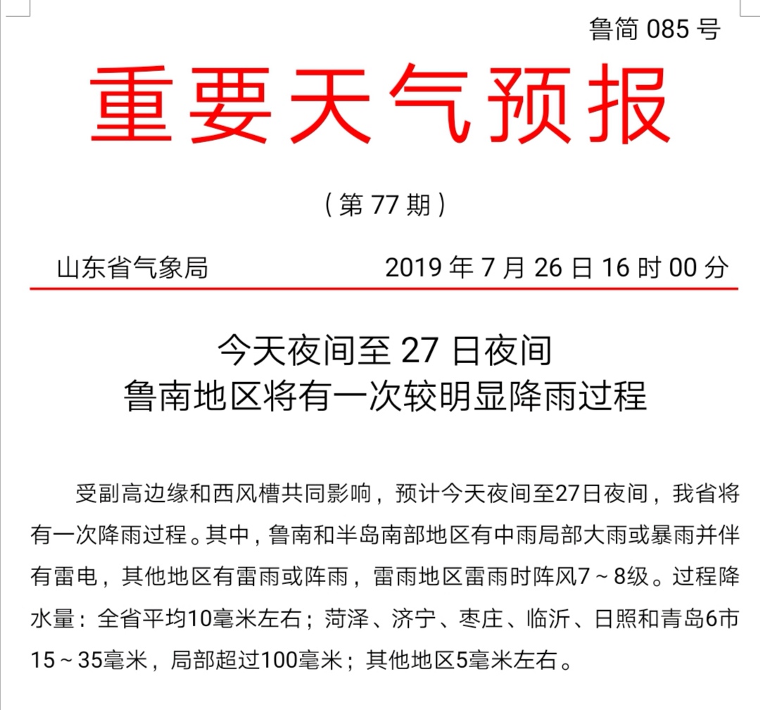 27日夜间到28日白天,全省天气多云间阴,鲁东南和半岛南部地区有中雨局部大雨或暴雨并伴有雷电,其他地区有雷雨或阵雨。南风3~4级,雷雨地区雷雨时阵风7~8级。