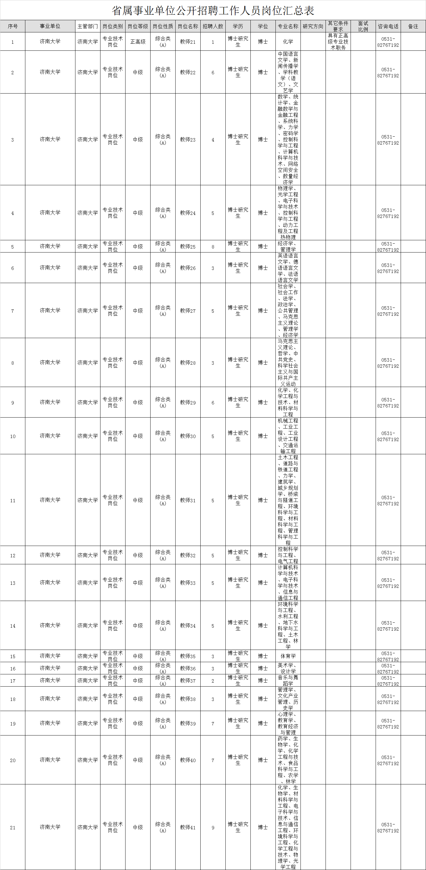 根据省委组织部、省人力资源和社会保障厅《关于2019年省属事业单位公开招聘工作人员有关问题的通知》(鲁人社发〔2018〕 66号)要求,结合工作需要,拟面向社会公开招聘工作人员,中高级专业技术岗位70人。具体岗位及条件详见:
