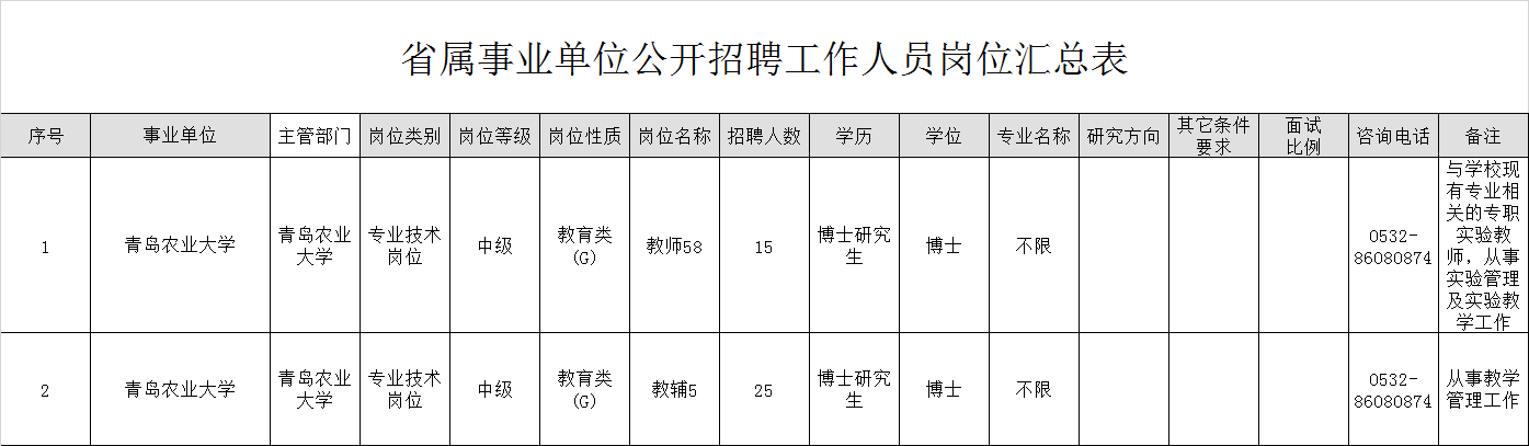 根据省委组织部、省人力资源和社会保障厅《关于2019年省属事业单位公开招聘工作人员有关问题的通知》(鲁人社发〔2018〕66号)要求,结合工作需要,青岛农业大学拟面向社会公开招聘中级专业技术岗位人员40人。具体岗位及条件详见: