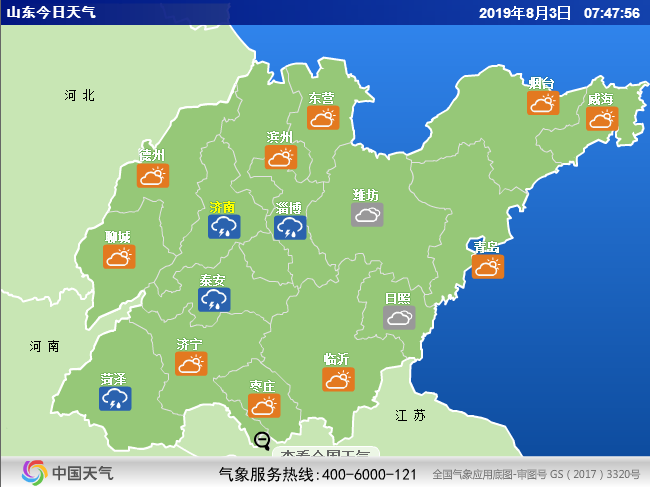 大众网·海报新闻济南8月3日讯(记者 李立红) 山东省气象台今晨发布最新天气预报,今天白天到夜间,全省天气多云间阴,鲁西北、鲁中和鲁南的部分地区有雷雨或阵雨,半岛地区局部有雷雨或阵雨。鲁西北、鲁西南和鲁中的西部地区北风转东南风3~4级,其他地区南风3~4级,雷雨地区雷雨时阵风7~9级。