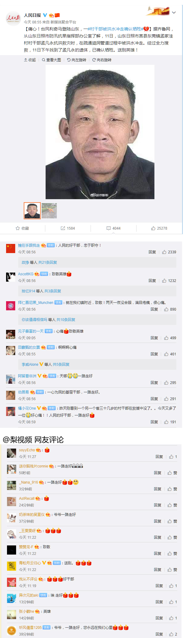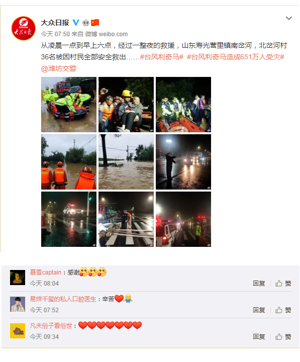 人民日报和大众日报微博关于山东遭遇台风“利奇马”的报道下,网友们也纷纷为山东加油!