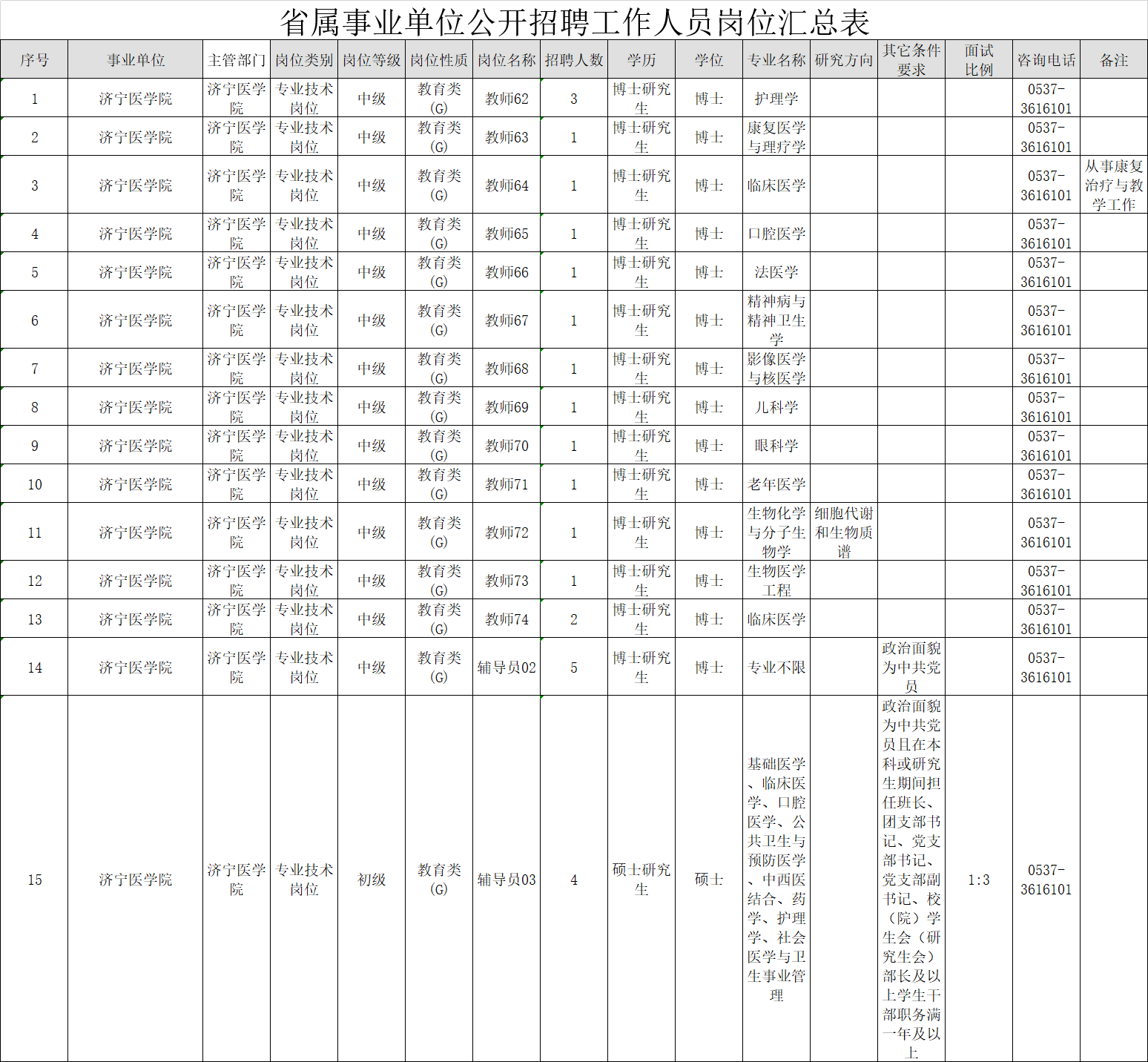 根据省委组织部、省人力资源和社会保障厅《关于2019年省属事业单位公开招聘工作人员有关问题的通知》(鲁人社发〔2018〕66号)要求,结合工作需要,济宁医学院拟面向社会公开招聘中级岗位专业技术人员21名,初级岗位专业技术人员4名,具体岗位及条件详见: