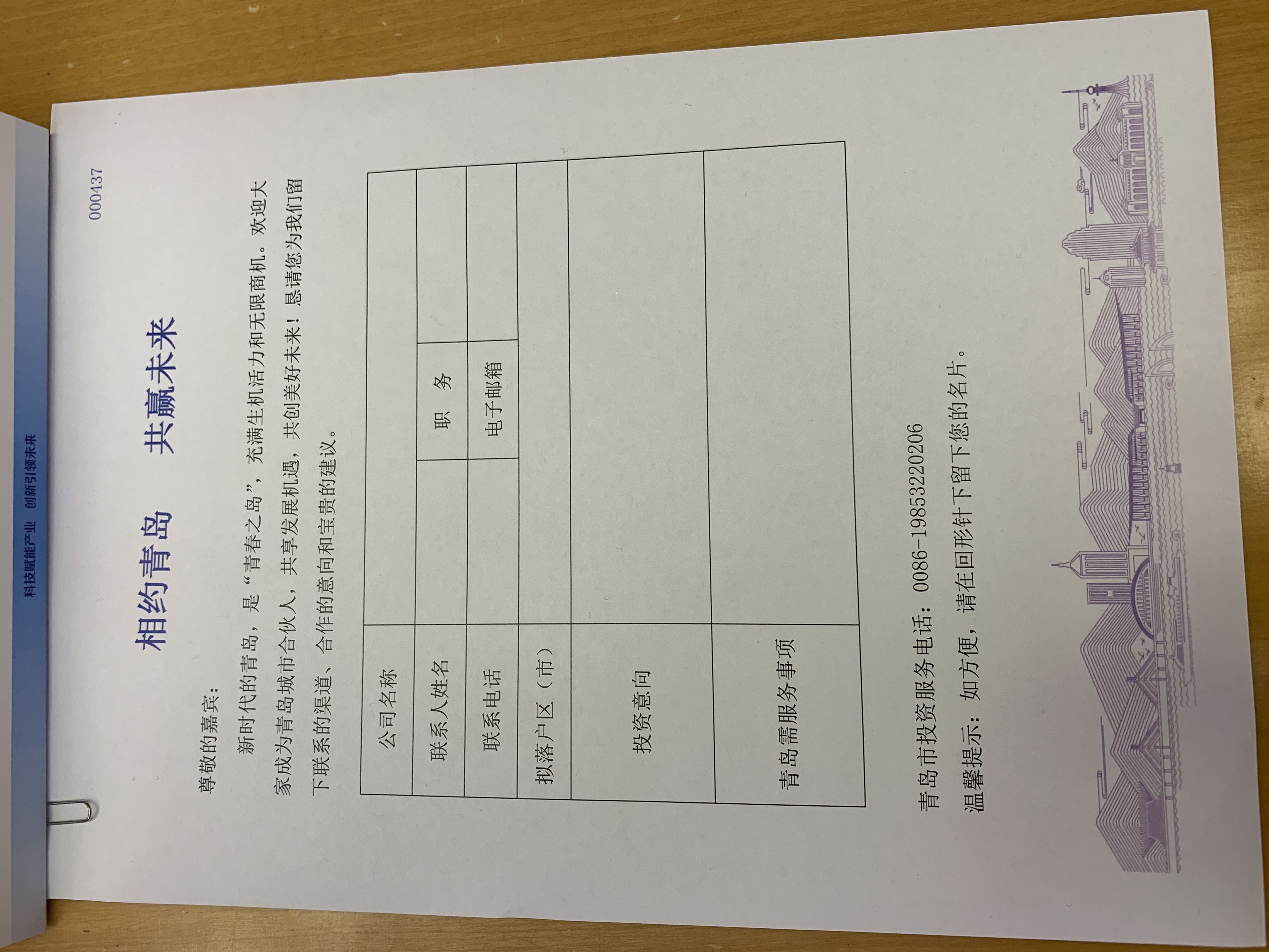 大众网·海报新闻济南9月9日讯(记者吴军林)9日下午,大众网·海报新闻记者在青年企业家创新发展国际峰会2019青岛专场推介会注意到,每位参会嘉宾的桌上都摆放了一张带有编号的信息表,包括公司名称、联系人姓名、联系电话、拟落户区(市)、投资意向和青岛需服务事项等。