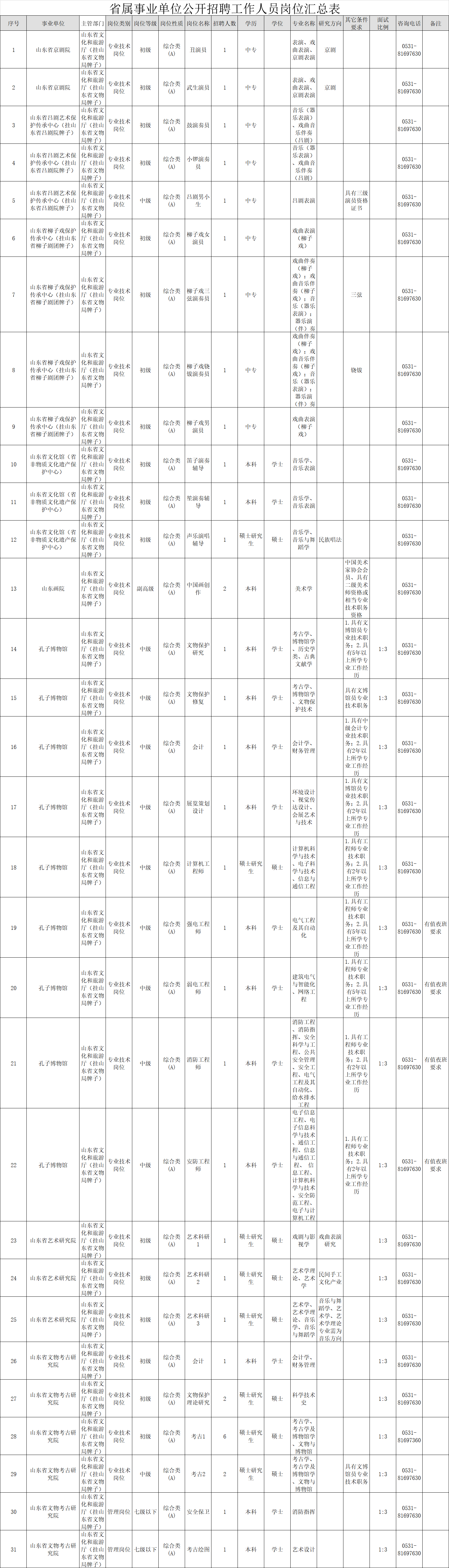 根据省委组织部、省人力资源和社会保障厅《关于2019年省属事业单位公开招聘工作人员有关问题的通知》要求,结合工作需要,省文化和旅游厅所属山东省京剧院、山东省吕剧艺术保护传承中心(山东省吕剧院)、山东省柳子戏艺术保护传承中心(山东省柳子剧团)、山东省文化馆、山东画院、孔子博物馆、山东省艺术研究院、山东省文物考古研究院等8个事业单位拟面向社会公开中高级岗位和艺术表演类岗位工作人员39人。具体岗位及条件详见: