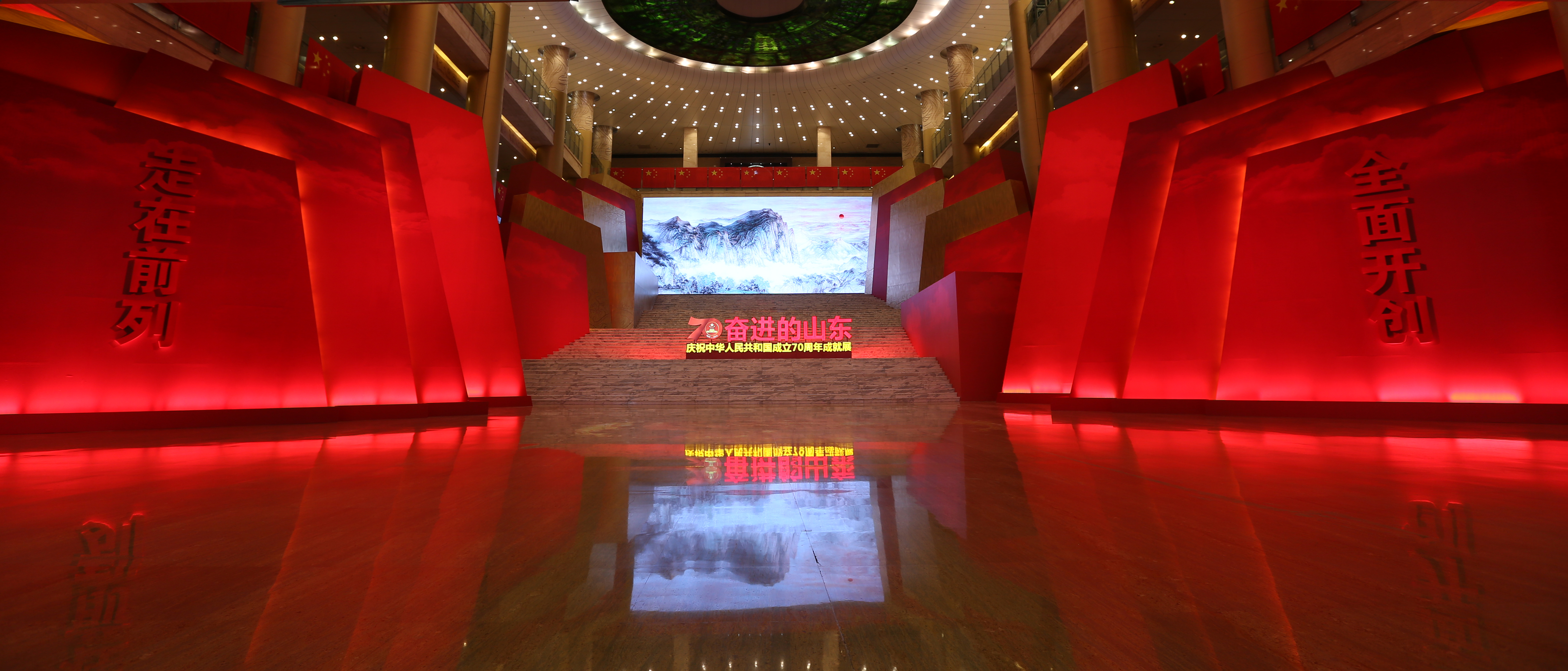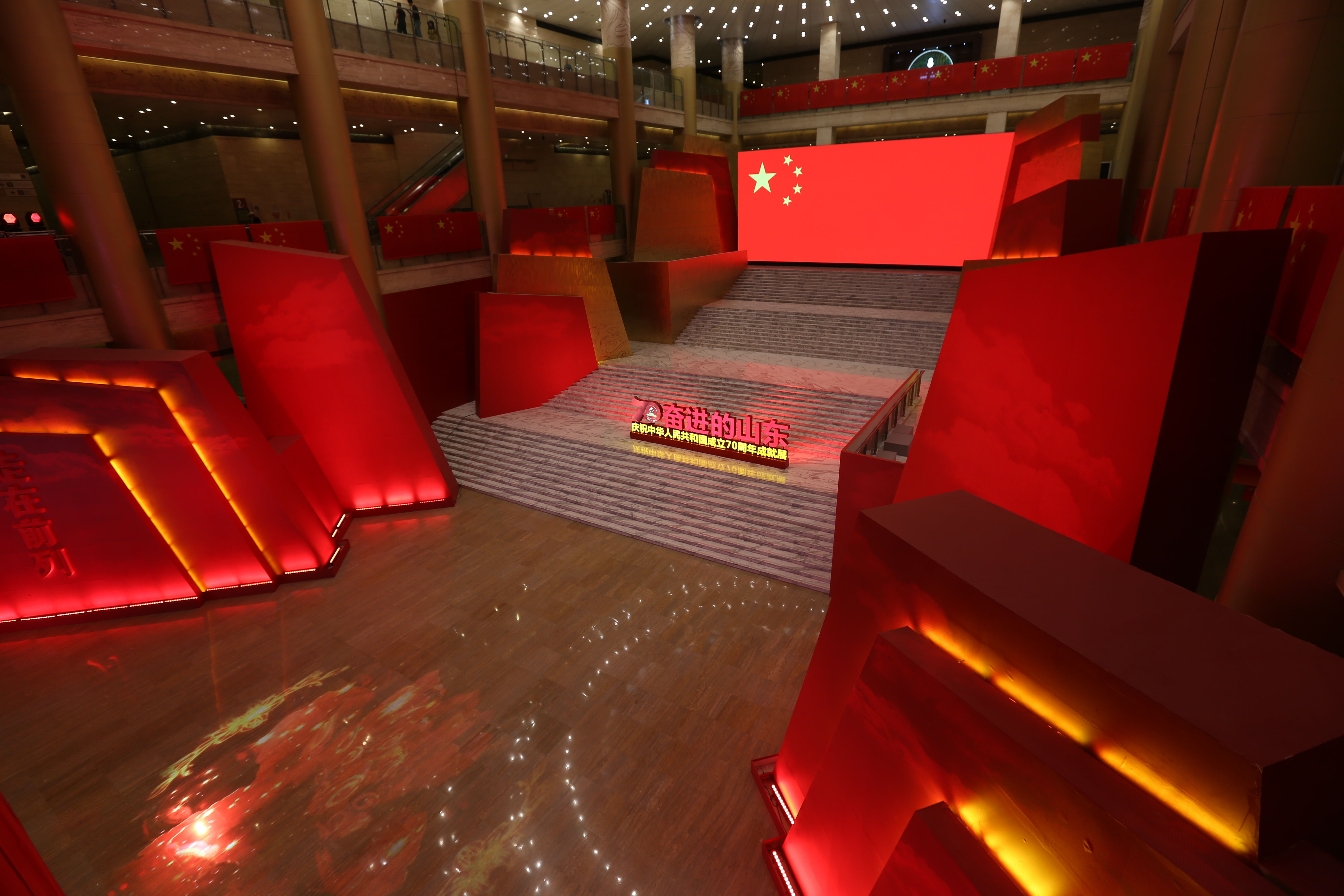 台阶顶端设置巨幅显示屏,循环播放国旗画面、为“上合青岛峰会”而创作的《国泰民安》巨幅画卷。其中,《国泰民安》山水画以泰山为创作主题,艺术地展现出朝阳辉映下的泰山气势宏伟、意象万千、云蒸霞蔚的壮丽景象,寓意盛世祥瑞,江山永固,国泰民安。作品在艺术语言上追求创新,绘画格局宏大,是中国画创作的代表性公共艺术作品。另外,在博物馆室外广场悬挂国旗、设置花坛,树立“奋进的山东”主题大字,播放宣传主题片,营造浓厚的国庆氛围,进一步丰富了公共艺术的呈现形式。