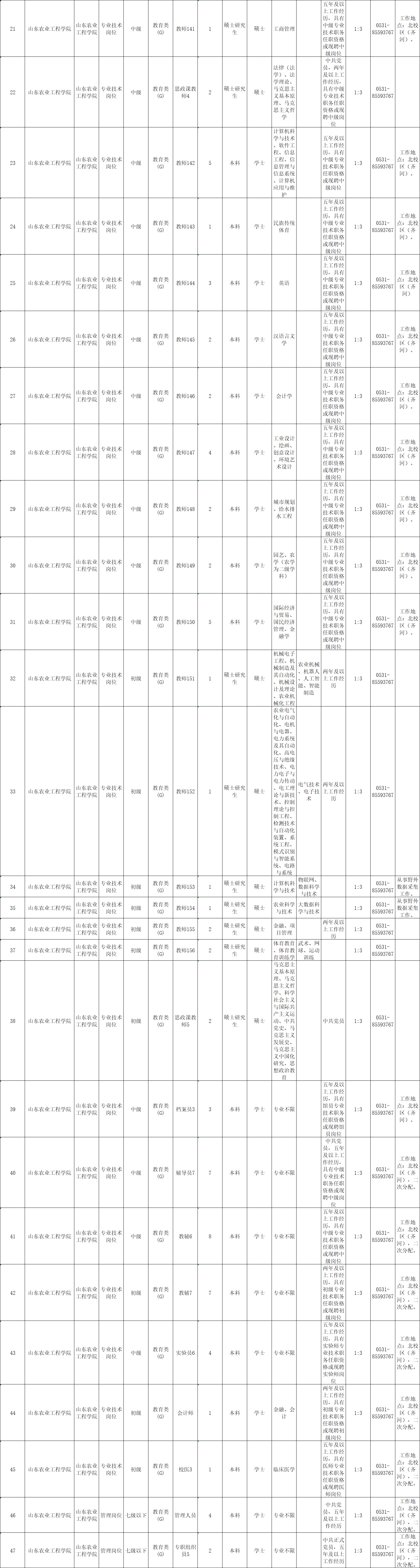 根据省委组织部、省人力资源和社会保障厅《关于2019年省属事业单位公开招聘工作人员有关问题的通知》(鲁人社发〔2018〕66号)要求,结合工作需要,山东农业工程学院拟面向社会公开招聘专业技术岗位工作人员96人,其中,高级岗位5人,中级岗位66人,初级岗位19人,管理七级以下岗位6人。具体岗位及条件详见: