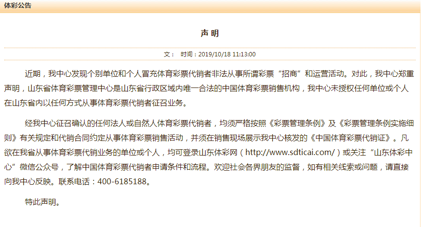 声明表示,近期,我中心发现个别单位和个人冒充体育彩票代销者非法从事所谓彩票“招商”和运营活动。对此,我中心郑重声明,山东省体育彩票管理中心是山东省行政区域内唯一合法的中国体育彩票销售机构,我中心未授权任何单位或个人在山东省内以任何方式从事体育彩票代销者征召业务。