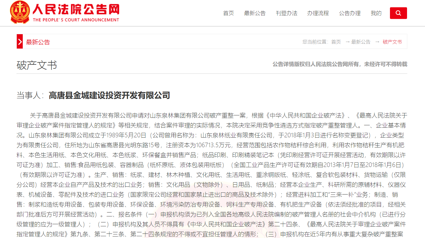 大众网·海报新闻济南10月20日讯(记者 辛振东)记者从人民法院公告网获悉,高唐县人民法院19日发布关于高唐县金城建设投资开发有限公司申请对山东泉林集团有限公司破产重整一案的公告。
