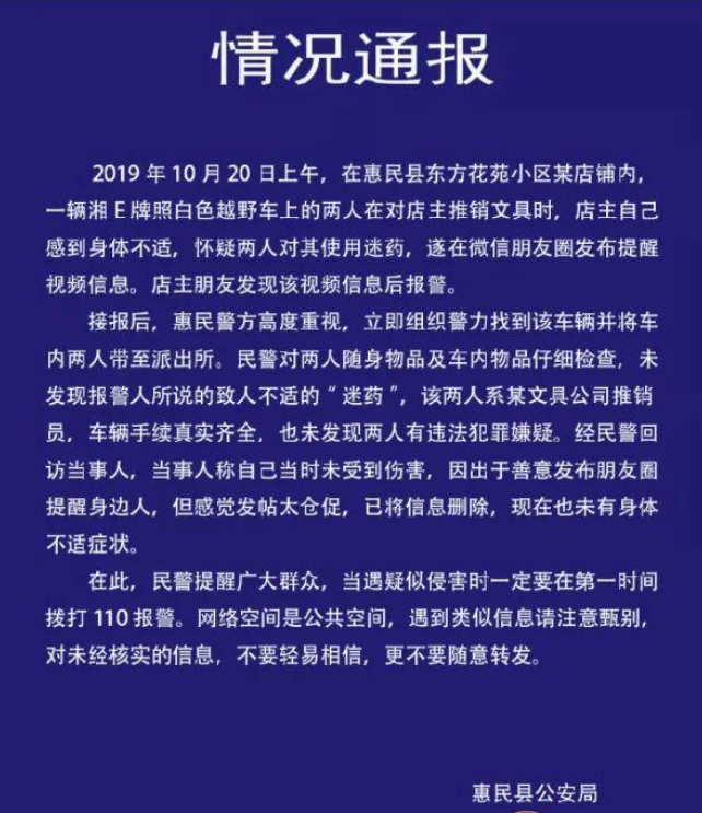 对此,惠民县公安局调查通报指出,2019年10月20日上午,在惠民县东方花苑小区某店铺内,—辆湘E牌照白色越野车上的两人在对店主推销文具时,店主自己感到身体不适,怀疑两人对其使用迷药,遂在微信朋友圈发布视频信息,店主朋友发现该视频信息后报警。