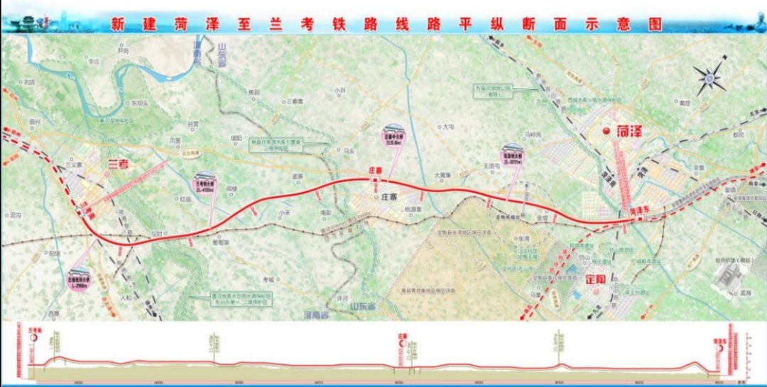 鲁南高铁是国家“八纵八横”高速铁路网的重要连接线,也是山东省“四横六纵”高速铁路网的南部“一横”,是山东省建设里程最长、投资规模最大、惠及沿线人口最多的铁路项目。项目采用分段建设模式,其中,日照至临沂至曲阜段已开始试运行,将于11月开通运营;曲阜至菏泽段2018年12月开工,目前正加快推进线下工程建设;菏泽至兰考段自菏泽东站引出,向西经菏泽市牡丹区、开发区、定陶区、曹县、东明县、开封市兰考县、商丘市民权县,止于郑徐客专兰考南站,正线全长约85公里,项目总投资110亿元,设计时速350公里,全线共设菏泽东站、庄寨站、兰考南站3个车站。