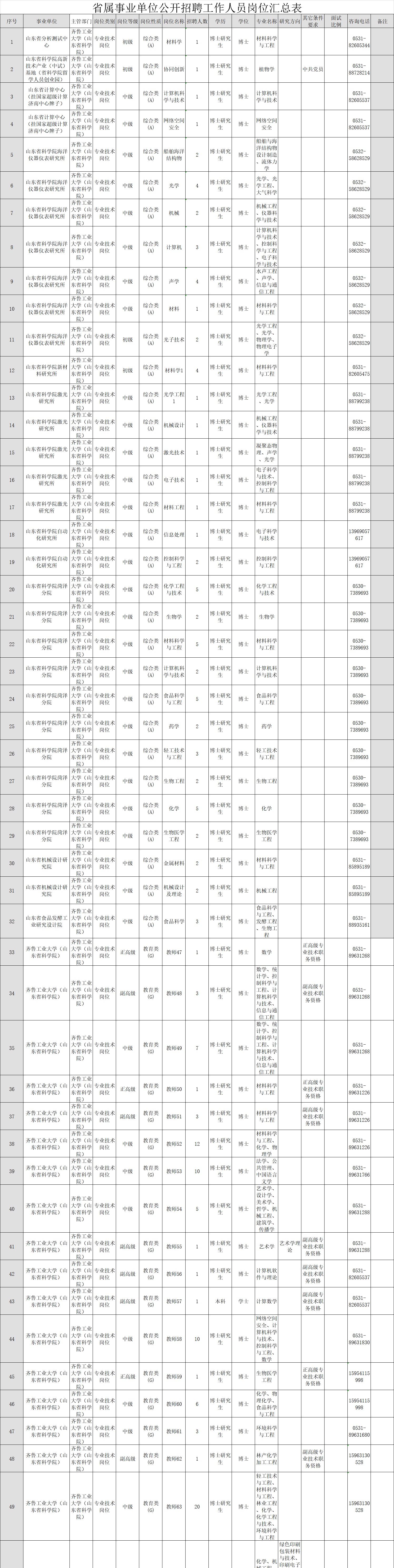 根据省委组织部、省人力资源和社会保障厅《关于2019年省属事业单位公开招聘工作人员有关问题的通知》(鲁人社发﹝2018﹞66号)要求,结合工作需要,齐鲁工业大学(山东省科学院)拟面向社会公开招聘工作人员377名。