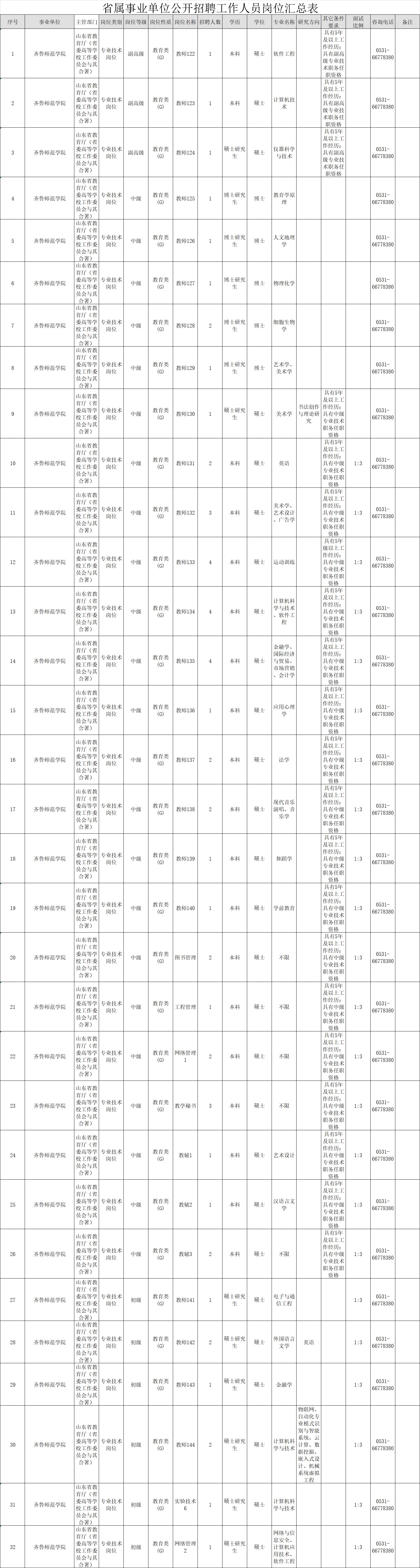 根据省委组织部、省人力资源和社会保障厅《关于2019年省属事业单位公开招聘工作人员有关问题的通知》(鲁人社发﹝2018﹞66号)要求,结合工作需要,齐鲁师范学院拟面向社会公开招聘副高级及中初级专业技术岗位工作人员54名。