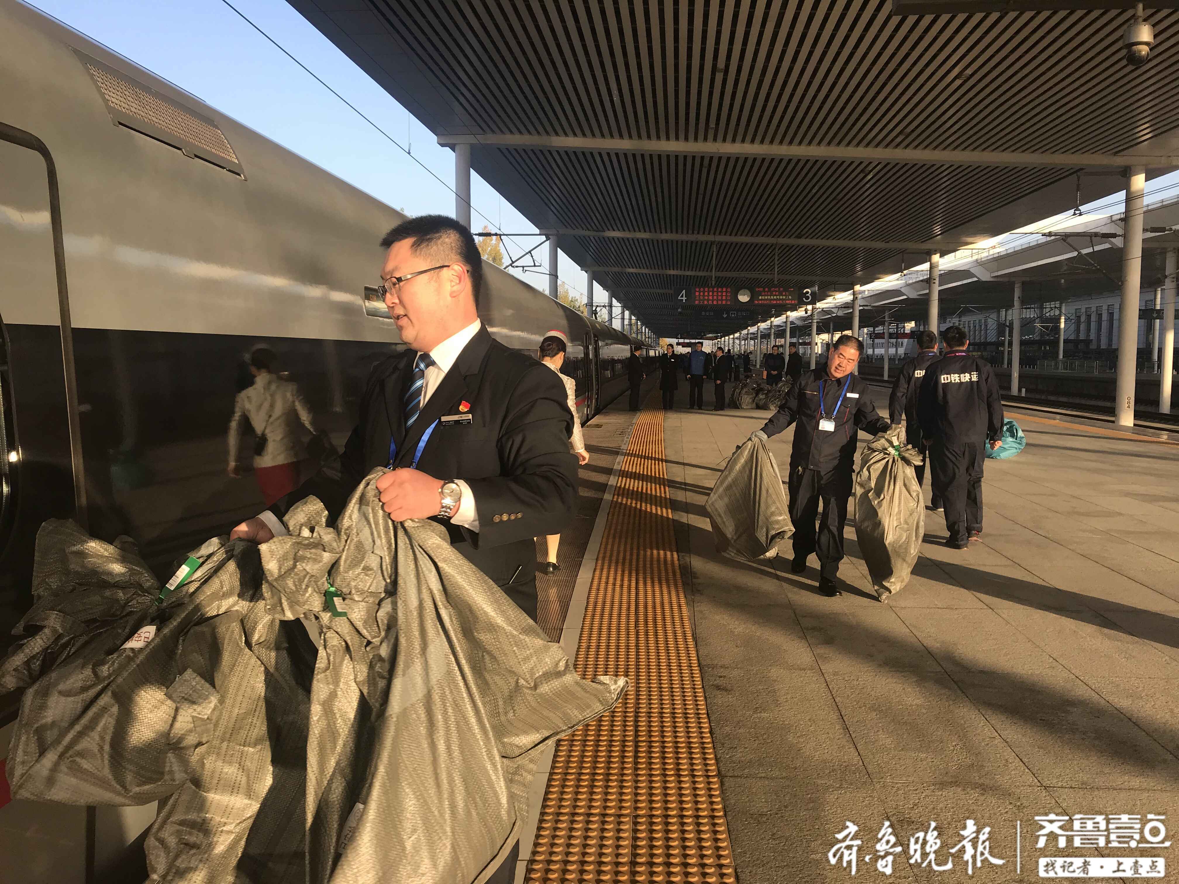 11月11日早上7点20分,在泰安高铁站4站台上,发往北京南的G338次“复兴号”高铁列车准时抵达。与平日不同,在2号车厢门口,整齐码放着73个高铁专用快递包裹袋,共计400多件快递。2个多小时后,这些货物将抵达北京。预计今年“双十一”黄金周期间,泰安将有15吨货物将通过高铁发往全国。