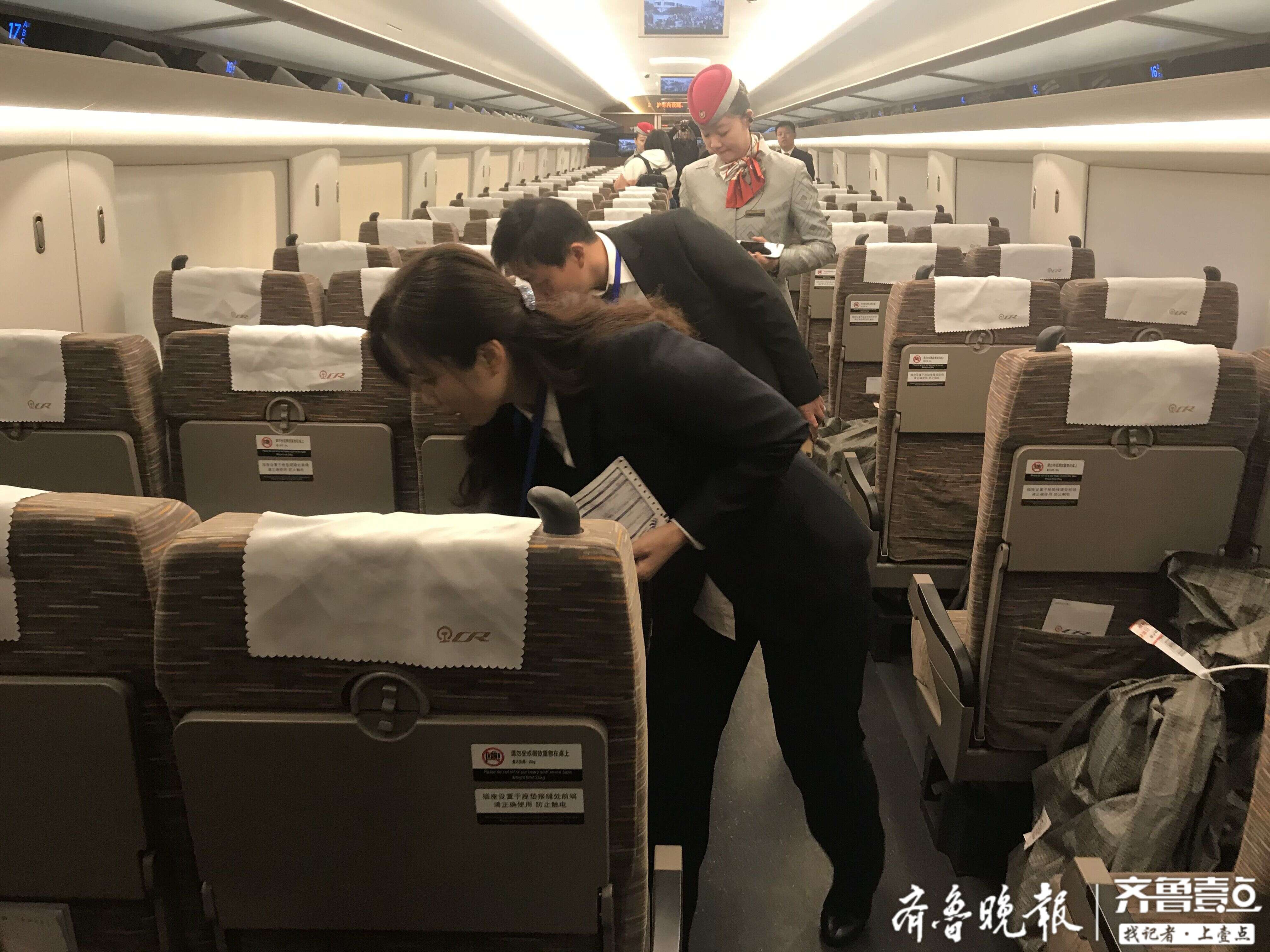 7点20分,装车开始。工作人员源源不断的把快递包裹运进车厢,整齐摆放在车厢座位底部,中间留有通道。搬运、摆放、清点……各个步骤,一气呵成。仅用了10分钟,全部货物摆放完毕,随车工作人员与高铁泰安站工作人员随后进行交接。“检测合格后列车才能正常开出。”高铁泰安站副站长高子杨说。