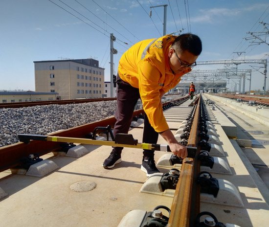 11月13日,临沂工务段日兰高铁介入组副主任纪伟正在测量铁轨间距。.jpg