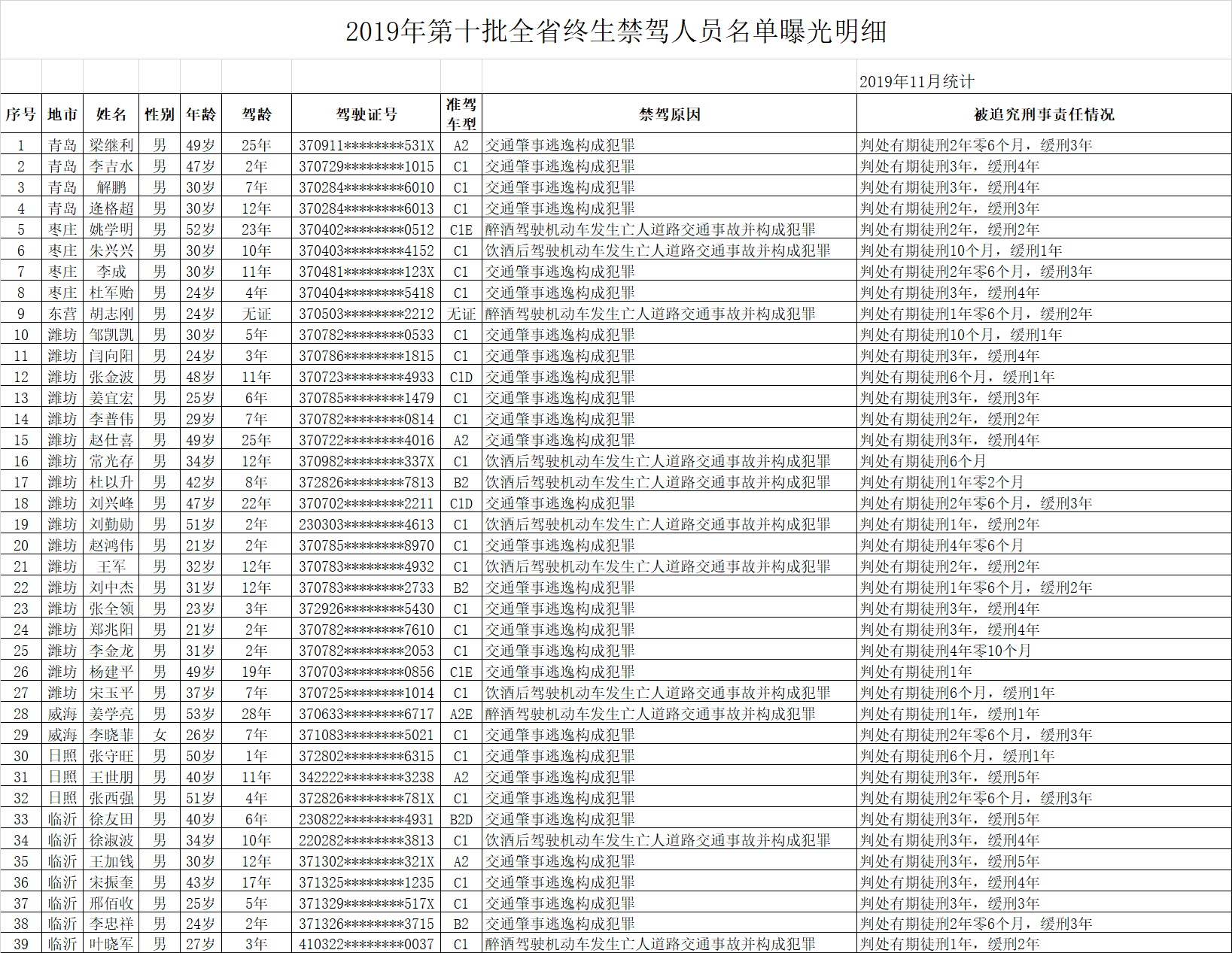 11月26日,山东省公安厅交通管理局向社会公开发布今年第十批终生禁驾名单,共39人。(大众日报客户端记者 张依盟 报道)