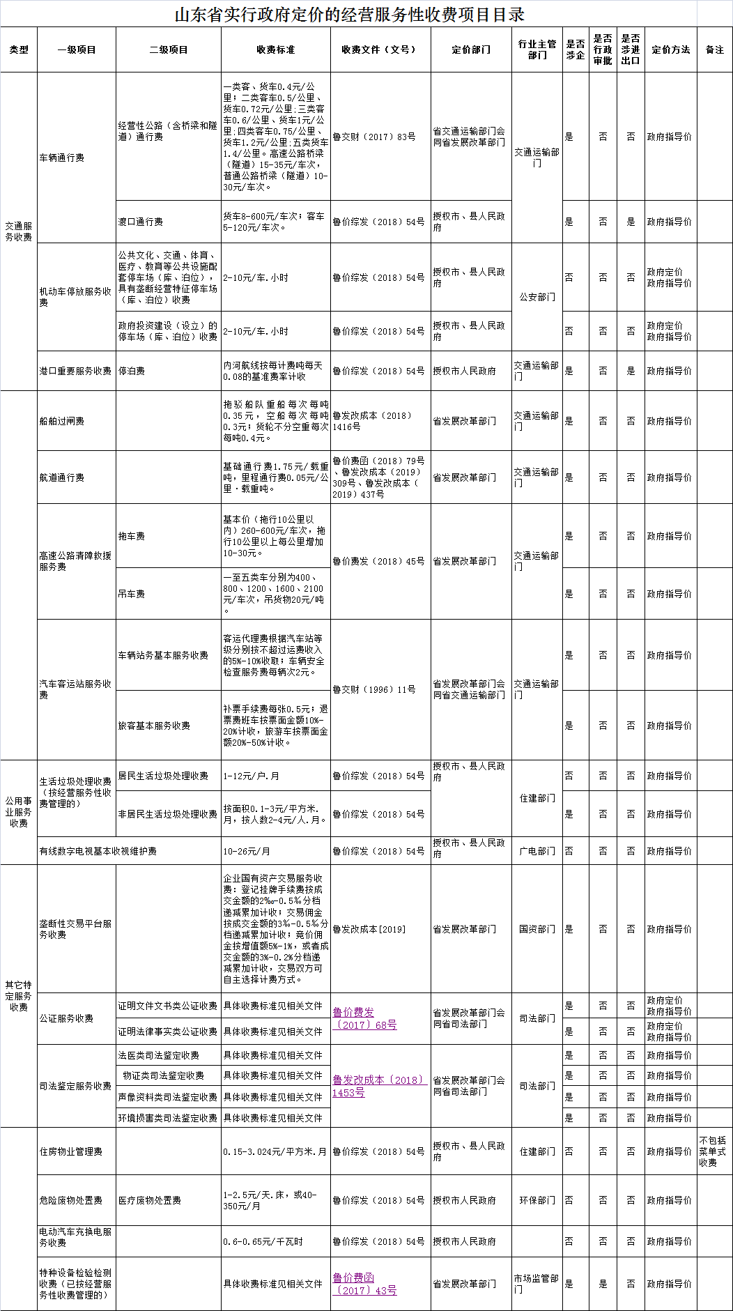 山东省政府定价经营服务性收费目录清单公布