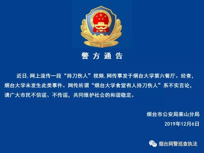 近日,网上流传一段“持刀伤人”视频,网传事发于烟台大学第六餐厅。烟台警方通报,经查,烟台大学未发生此类事件。网传所谓“烟台大学食堂有人持刀伤人”系不实言论,请广大市民不信谣、不传谣,共同维护社会的和谐稳定。