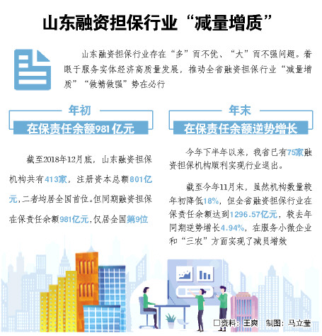 根据中国银保监会统计,截至2018年12月底,山东融资担保机构共有413家,注册资本总额801亿元,二者均居全国首位。但同期融资担保在保责任余额981亿元,仅居全国第9位,机构总量和行业体量与作用发挥明显不成比例。