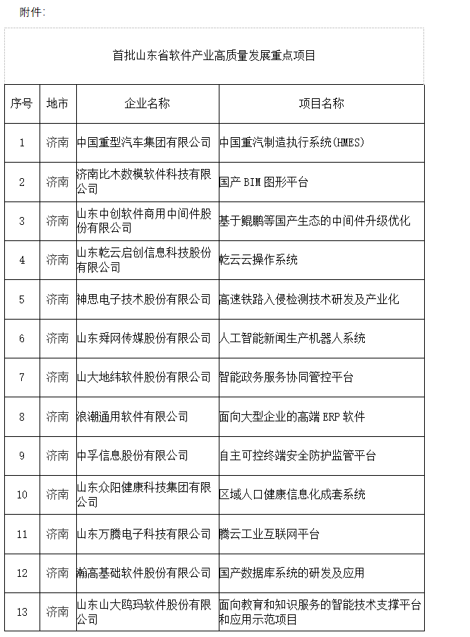 日前,记者从山东省工信厅获悉,按照《关于开展我省软件产业高质量发展重点项目申报工作的通知》要求,省工业和信息化厅组织专家,对各市推荐的软件产业高质量发展重点项目申报材料进行了评审,现将通过审核的名单(见附件)予以公示。