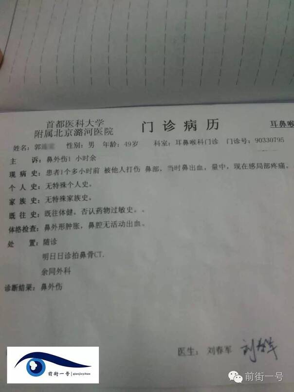 19日上午,记者见到郭师傅时,他右胳膊肘的伤口已结痂,他头部多处受伤,双眼充满血丝,右眼角有淤青,鼻骨骨折。“他们用脚踩我的脸,我当时都岔气了,动弹不得。现在整个脸都疼,吃东西都很费力”。郭师傅还称,他的胸部到腹部都感到疼痛。