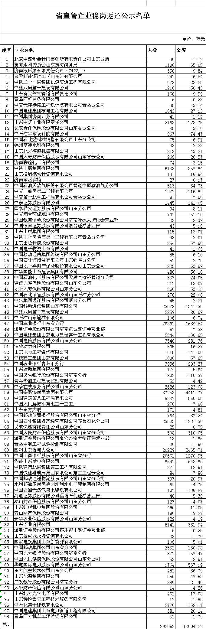 根据《山东省人力资源和社会保障厅山东省财政厅山东省发展改革委员会山东省工业和信息化厅关于进一步做好职业保险支持企业稳定就业岗位的通知》(鲁人社字〔2019〕85号),省人力资源社会保障厅对11月底前申请2018年度稳岗返还的省直管企业申报材料进行了审核,现将审核通过的2018年度申报企业名单予以公示(名单附后)。