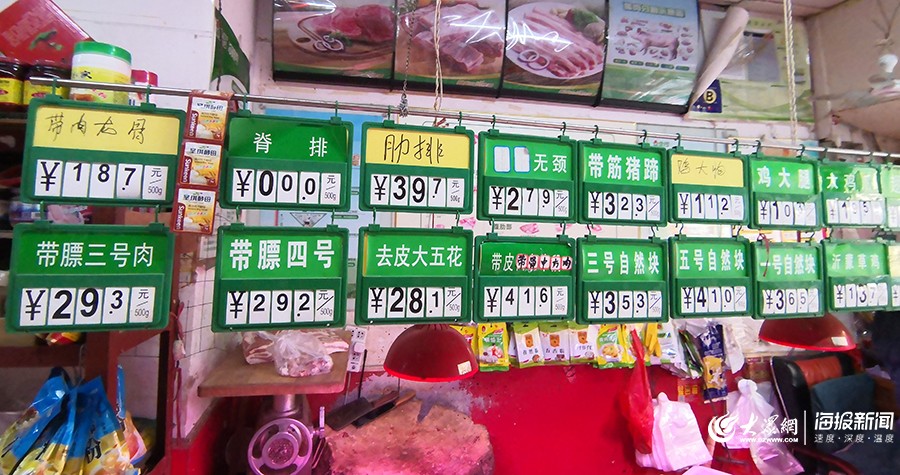 大众网·海报新闻济南12月26日讯(记者 张稳) “去皮大五花28.1元/斤,带膘三号肉29.3元/斤,带膘四号肉29.2元/斤,一号自然块块36.5元/斤、三号自然块35.3元/斤,五号自然块41元/斤……”随着元旦、春节临近,肉类消费将迎来旺季,猪肉价格是否会迎来大幅增长,成为市民普遍关心的问题。12月26日下午,记者在济南市槐荫区西市场附近一家菜市场猪肉价格牌上看到,猪肉价格和上月相比有了不小的降幅,五花肉、自然块等均已经跌进30元大关。