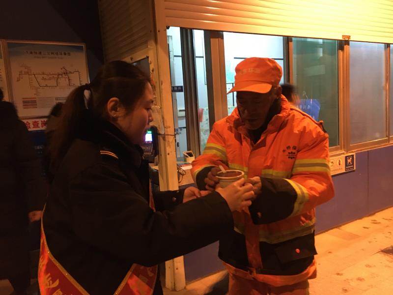 在公交站台休息的环卫工人喝上了热乎乎的腊八粥!