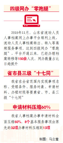 据介绍,为实现业务经办“一个平台”,山东在全省范围内实现事项名称、受理条件、服务对象、申请材料、办理时限等要素省、市、县三级“十七同”。“省内档案转移直接在平台上操作,阻碍人事档案省内转移的区域壁垒被彻底打破。”山东省公共就业和人才服务中心人才服务处副处长张於光说。