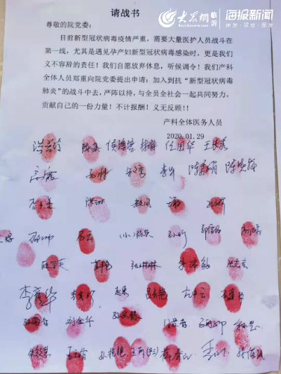 面对疫情,临沂市人民医院产科全体医务人员主动请缨,写下请战书。疫病面前,冲锋在前。危险面前,逆行而上。