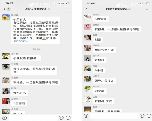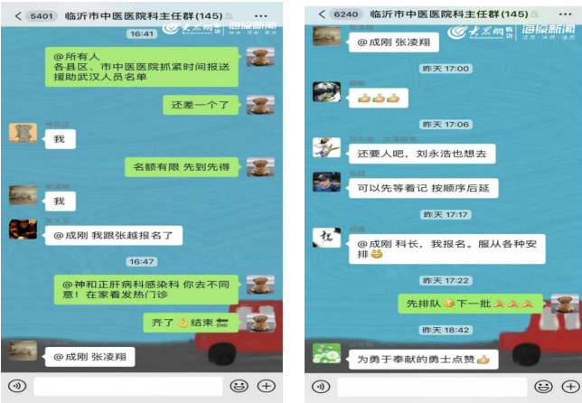 临沂市中医医院科主任微信群,当大家得知需要抽调人员援助武汉时,群里各科主任你一句,我一句,争相报名。