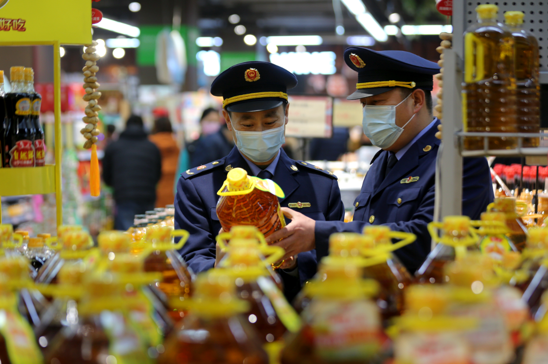 超市粮油区,市场监督管理局执法人员在核查在售食用油商品价格、生产日期等信息。