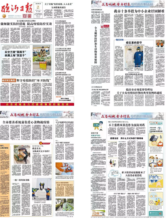 疫情消息时刻牵动人心,所有人都比平时更加关注新闻。作为临沂重要媒体,为营造权威、积极、有序的舆论氛围,临报集团融媒一支部27名采编党员提前结束假期,迅速行动,全员上岗,在众志成城、攻坚克难中展现了媒体人的责任担当。《临沂日报》大年初三提前恢复出报,开设“众志成城全力打赢疫情防控阻击战”专版,每天四个整版的疫情防控报道。先后组织了市政府两次新闻发布会的直播报道和“战疫·一线”四次大型融媒直播报道,总点击量近百万人次。连日来,融媒一支部一线编辑、记者在支委班子带领下,日夜奋战在防疫宣传一线,最大程度提高群众对全市疫情防控举措和科普知识的知晓率,为全市上下众志成城防控疫情提供了有力舆论支持。市委书记王玉君高度评价日报应对及时,营造了权威、积极、有序的舆论氛围,并要求将《临沂日报》送到各个社区、村居,让群众及时深入地了解疫情防控知识。(作者 苏娟娟)