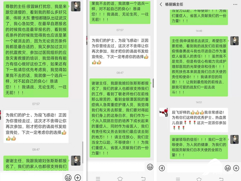 “看到报名条件,我觉得我也应该是第一个被派去的…我参加过汶川的抗震救灾… 看到我的战友们在前线跟疫情奋勇战斗,我也想尽自己作为重症人、省医人的责任…..我请求您的同意!让我到最危险的前线去,跟我可爱的战友们一起战斗!”