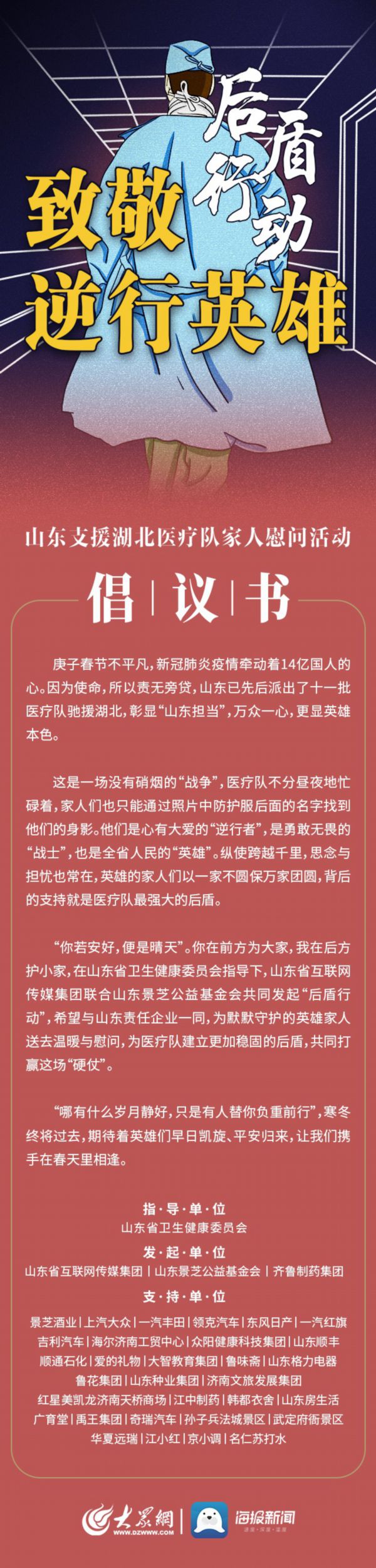 近日,在山东省卫生健康委员会指导下,山东省互联网传媒集团与山东景芝公益基金会、齐鲁制药集团联合倡议,发起了“致敬逆行英雄后盾行动——山东支援湖北医疗队家人慰问活动”。