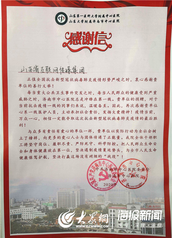 山东第一医科大学附属中心医院向山东省互联网传媒集团发来感谢信