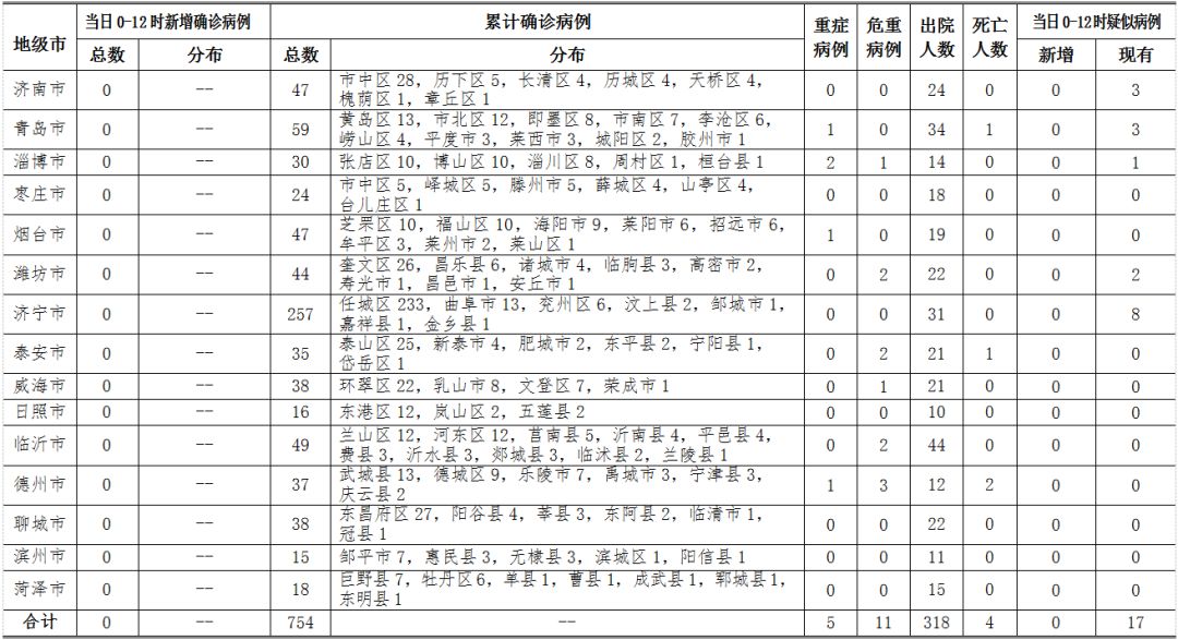 2020年2月23日0-12时,山东省无新增新型冠状病毒肺炎确诊病例,累计确诊病例754例(含重症病例5例,危重症病例11例,治愈出院318例,死亡病例4例);无新增疑似病例,现有疑似病例17例。截至目前,追踪到密切接触者16608人,已解除医学观察14793人,诊断为疑似或确诊病例291例,尚有1524人正在接受医学观察。