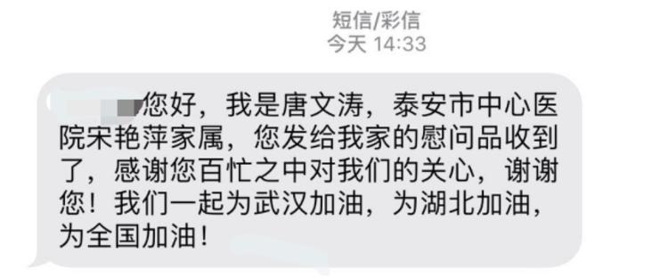 大众网·海报新闻济南2月22日讯(记者 辛振东)“发给我家的慰问品收到了!我们一起为武汉加油,为湖北加油,为全国加油!”这是山东省第二批支援湖北医疗队队员宋艳萍的丈夫唐文涛在收到快递后,给大众网·海报新闻的工作人员发来的短信。