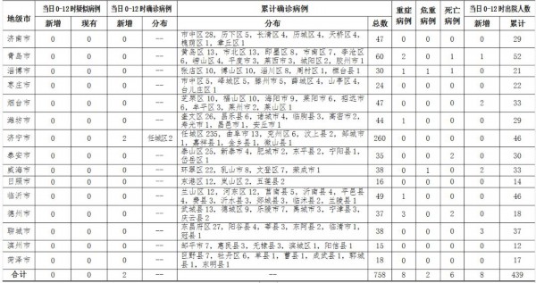 2020年3月1日0-12时,山东省无新冠肺炎疑似病例;新增确诊病例2例(均为集中隔离观察的无症状感染者,经核酸和CT等检查确诊),累计确诊病例758例(其中,重症病例8例,危重症病例2例,死亡病例6例);新增治愈出院8例,累计治愈出院439例。截至目前,追踪到密切接触者16872人,已解除医学观察15968人,诊断为疑似或确诊病例291例,尚有613人正在接受医学观察。