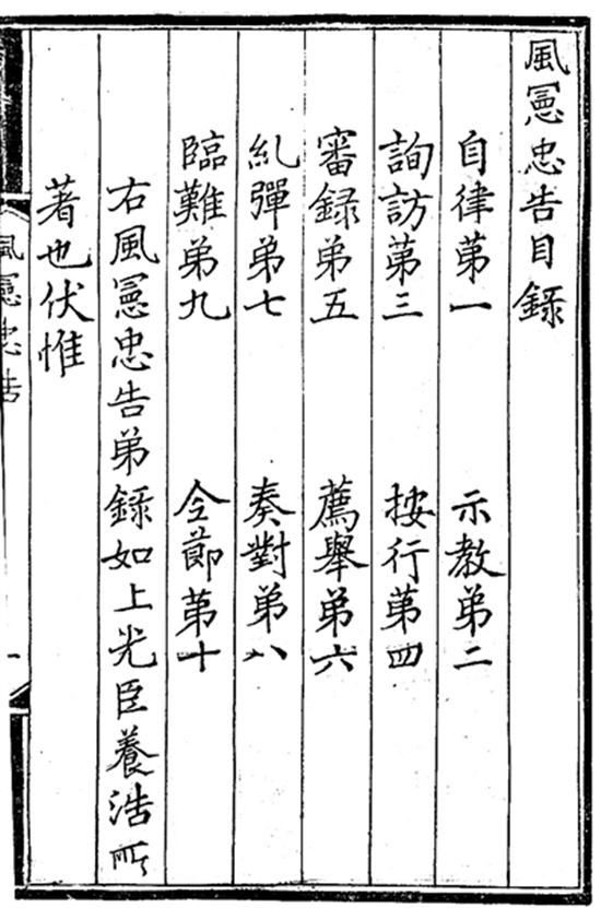 《为政忠告》第二曲《风宪忠告》,完成于张养浩担任监察御史时。《风宪忠告》全书一卷,分自律(洁身自爱)、示教(以身作则)、询访(实地考察)、按行(讲述清廉及注意家属仆役举止之重要)、审录(用刑谨慎)、荐举(务必公正、明辨良莠)、纠弹(纠弹贪官污吏的注意事项)、奏对(向上呈报的危险、困难及其重要性与该注意之处)、临难(遭到迫害时应有之气节)、全节(纠弹恶吏,保全气节)十篇。全书主要围绕官员的遵纪守法、如何当好监察官员来阐述,强调维护法纪,倡导道德自律。