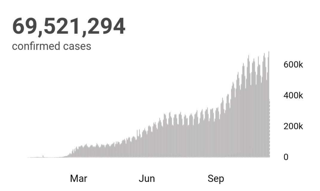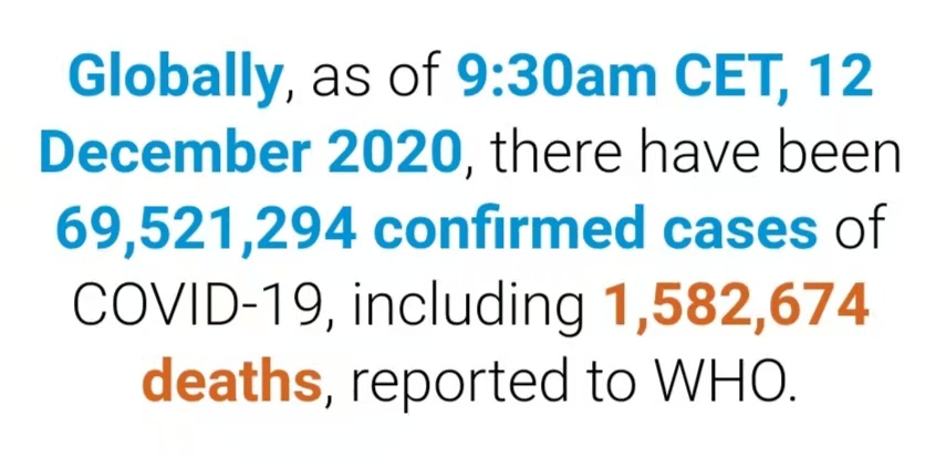 根据世卫组织最新实时统计数据,截至欧洲中部时间12月12日9时30分(北京时间12月12日16时30分),全球累计新冠肺炎确诊病例69521294例,累计死亡病例1582674例。(总台记者 朱赫)