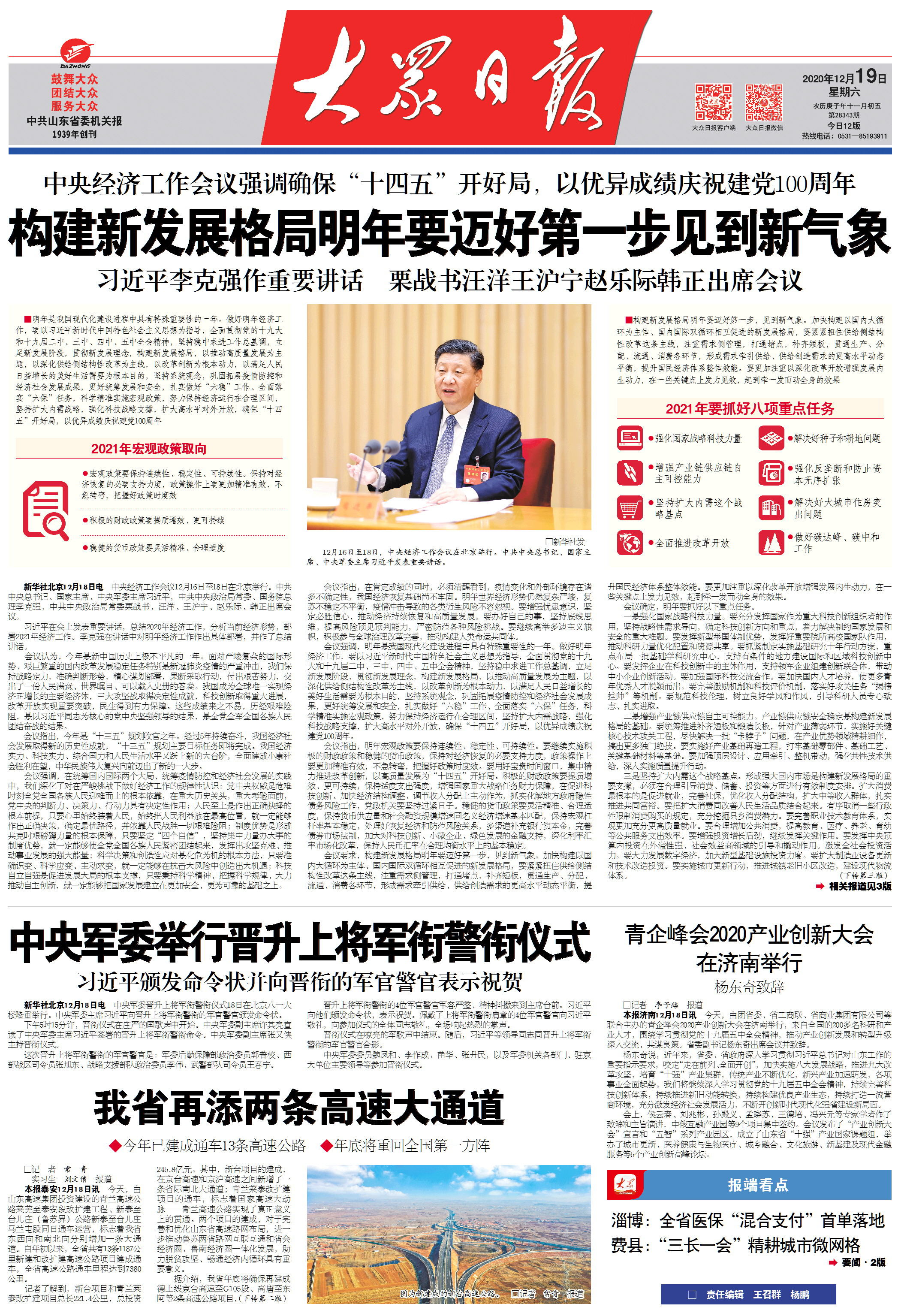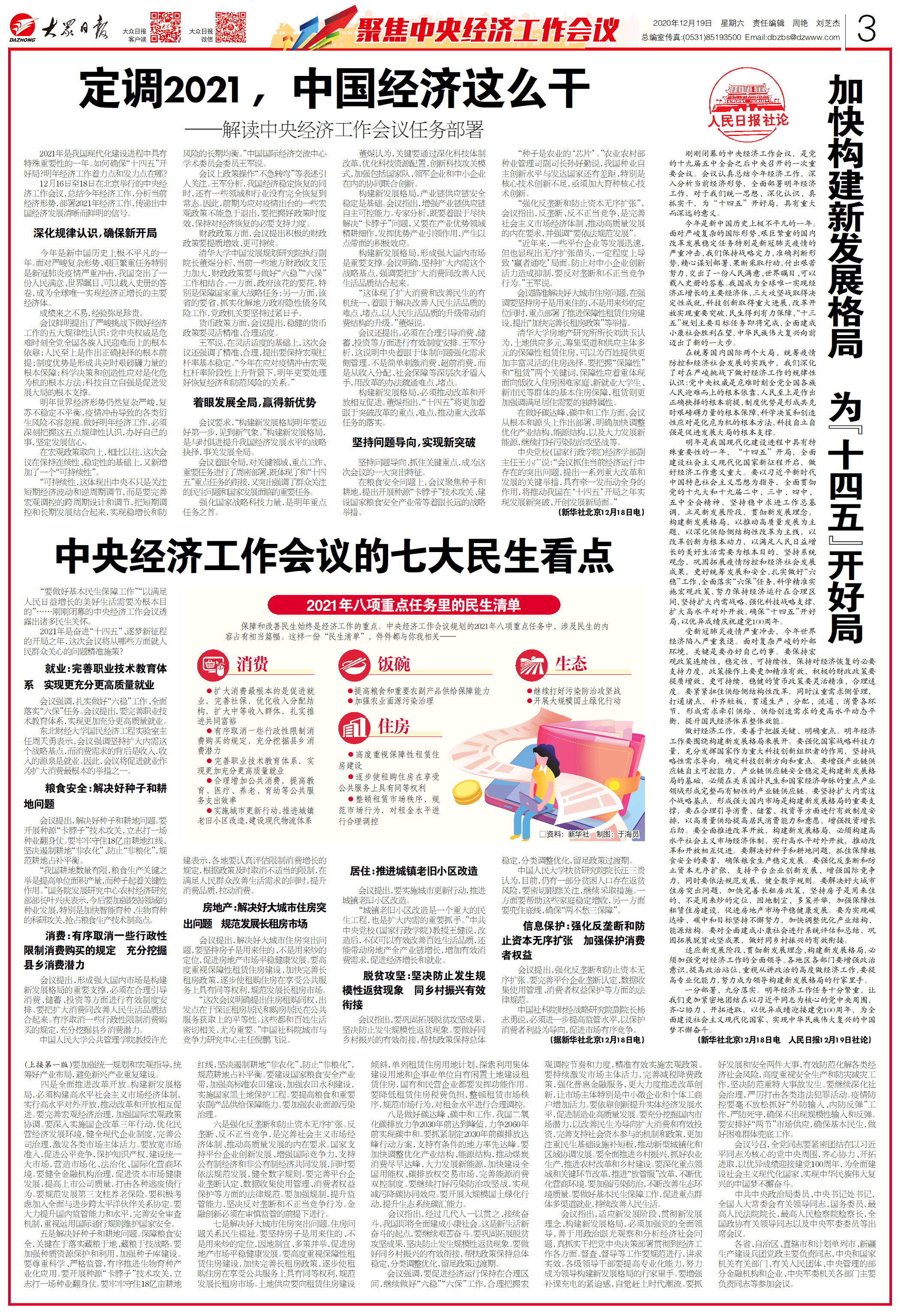 12月16日至18日在北京举行的中央经济工作会议,分析当前经济形势,对2021年经济工作作出新判断、新部署、新要求。会议指出,2021年是我国现代化建设进程中具有特殊重要性的一年。如何确保“十四五”开好局?明年经济工作着力点和发力点在哪?12月19日出版的大众日报推出专版报道为您解读中央经济工作会议。