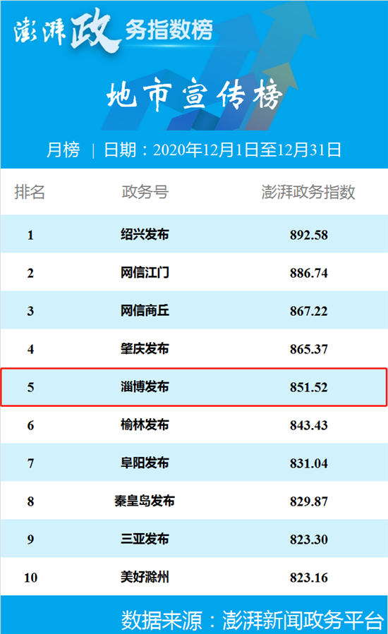 1月5日上午,澎湃新闻政务指数2020年12月榜(2020年12月1日-2020年12月31日)发布。淄博本地政务微信平台“淄博发布”在“地市宣传榜”中位列榜单第五!