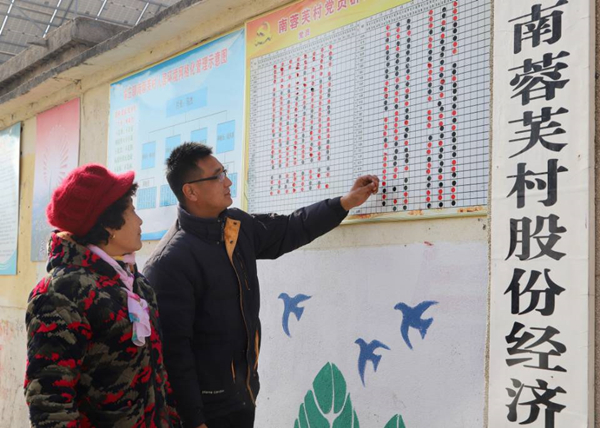 蒙阴县垛庄镇南蓉芙村党支部书记兼主任马杰和村民一起看党员评星定级考核表。