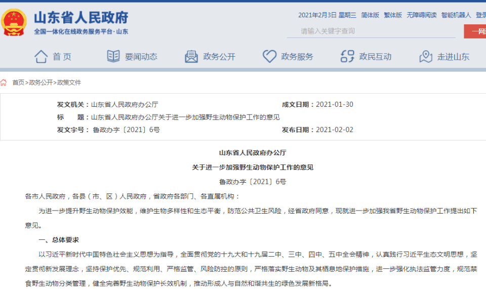 近日,山东省政府办公厅印发《关于进一步加强野生动物保护工作的意见》(下称《意见》),提出要严厉打击野生动物非法交易,从严从重查处违法违规行为。探索建立野生动物致害补偿机制,扎实推进禁食野生动物工作。