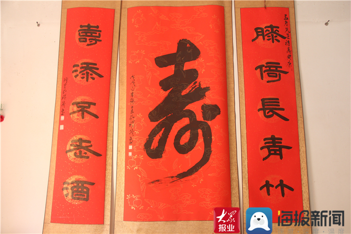 孟宪来老人网络上有一百余万粉丝,大家都很喜欢老人,也羡慕老人的晚年生活。一位曲阜的孔先生是老人的铁杆粉丝,专门为孟宪来写了一副对联和寿字,裱好之后,邮寄到老人的家中。