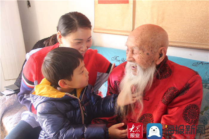 “老爷爷,我来看你啦。”“老爷爷,你的胡子怎么那么长?”孟宪来最小的重孙子孟祥栋在老人身边不停地说话,数数胡子,亲亲老人,老人高兴地合不拢嘴。据了解,孟祥栋今年6岁,恰好与老爷爷孟宪来相差100岁,孟祥栋经常依偎在老爷爷怀里抓抓胡须,两人也经常一起牵手外出,跨越一个世纪的亲情让邻居们很是羡慕。